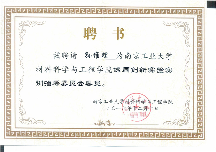孫維理董事長榮獲南京工業(yè)大學(xué)材料科學(xué)與工程學(xué)院授予的“協(xié)同創(chuàng)新實(shí)驗(yàn)實(shí)訓(xùn)指導(dǎo)委員會委員”。