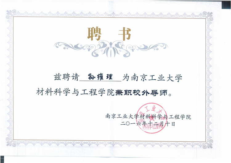 孫維理董事長被南京工業(yè)大學(xué)材料科學(xué)與工程學(xué)院聘請為“兼職校外導(dǎo)師”。