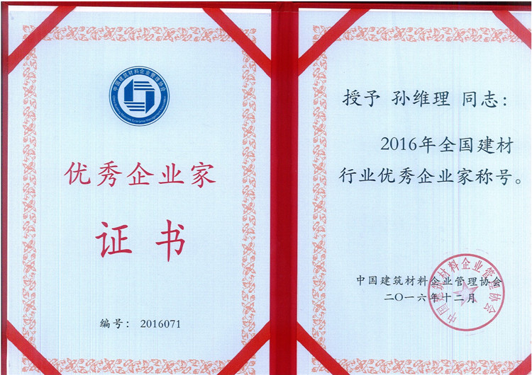 孫維理董事長榮獲中國建筑材料企業(yè)管理協(xié)會頒發(fā)的“2016年全國建材行業(yè)優(yōu)秀企業(yè)家稱號”